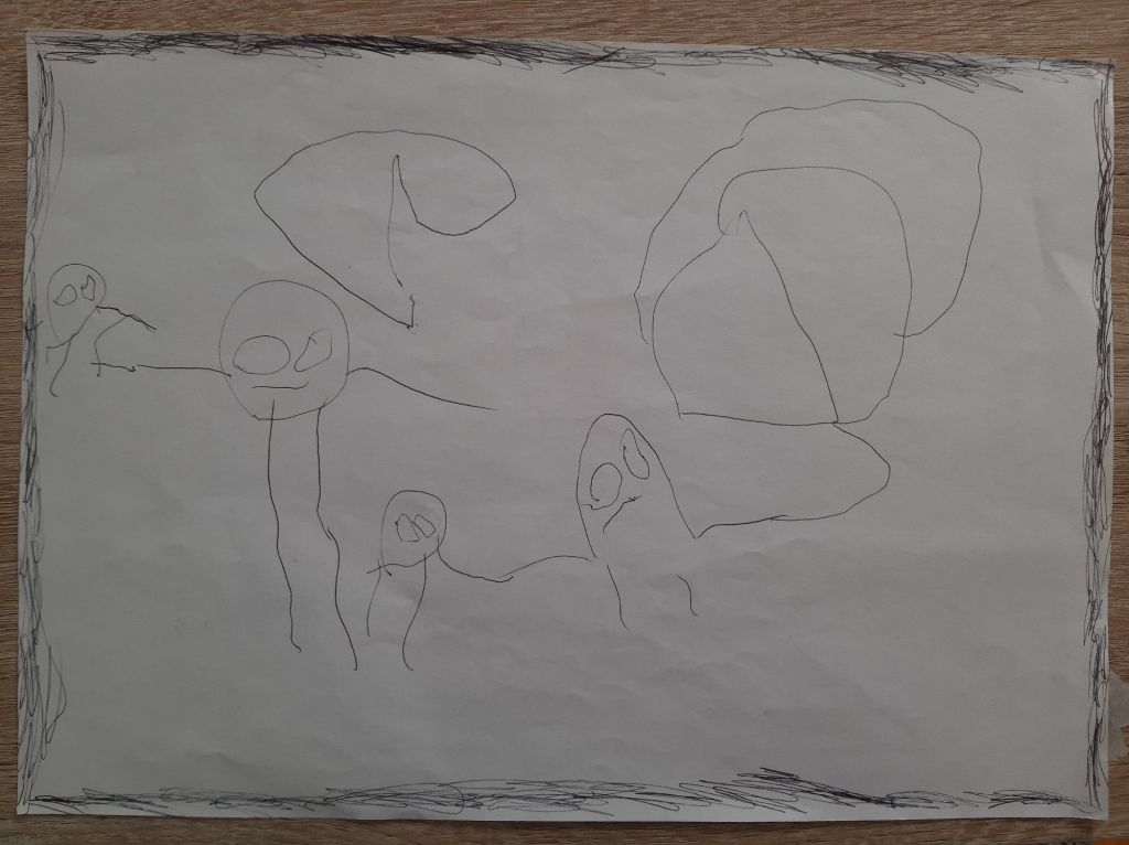 “Questo è un fantasma con un palloncino. E questo è un genitore (la figura più grande) che tira. E c’è un bambino, quando il bambino dà la mano al fantasma la casa esplode. C’è anche un papà, che dà la mano alla mamma e tirano più forte e la casa esplode.”