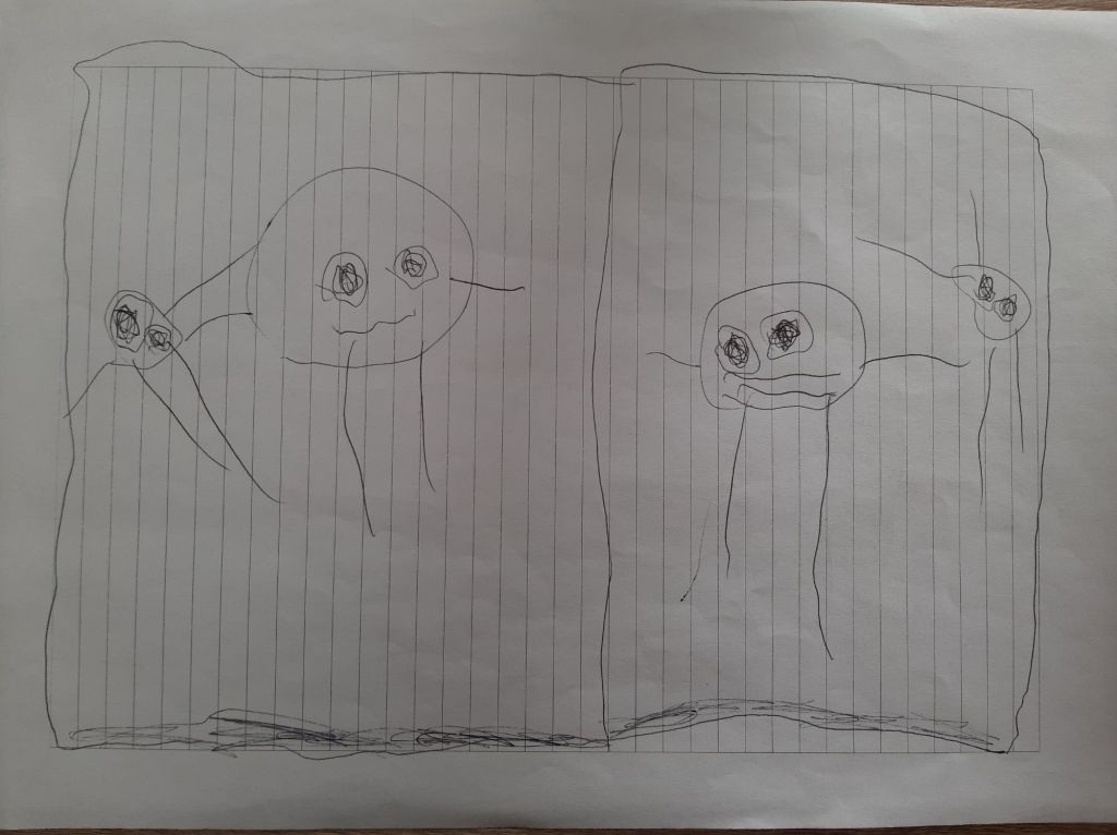 Subito dopo il primo disegno, ha girato il foglio e continuato. Prima ha disegnato i due rettangoli separati, poi ha cominciato a parlare. “Questo è lo zio e questa la zia” dice indicando le due figure grandi che ha appena disegnato, ognuna nel suo rettangolo. “E c’è un bambino (disegnandolo dal lato della zia) e una bambina (disegnandolo dal lato dello zio). Però il maschio fa un po’ paura.” Disegna l’interno degli occhi dei bambini in nero e dice “i bambini vedono gli steroidi.”